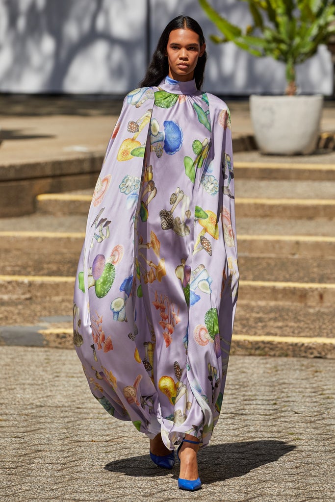 Last month, when Monse staged its New York Fashion Week IRL comeback, designers Laura Kim and Fernando Garcia stepped out of their usual toolkit of stripes and bold minimalism to show mushroom prints on everything from asymmetrical skirts and silk dresses to chunky cardigans. The designers shared with Vogue that the concept of escape — both physical and figurative — was a major inspiration in this collection.