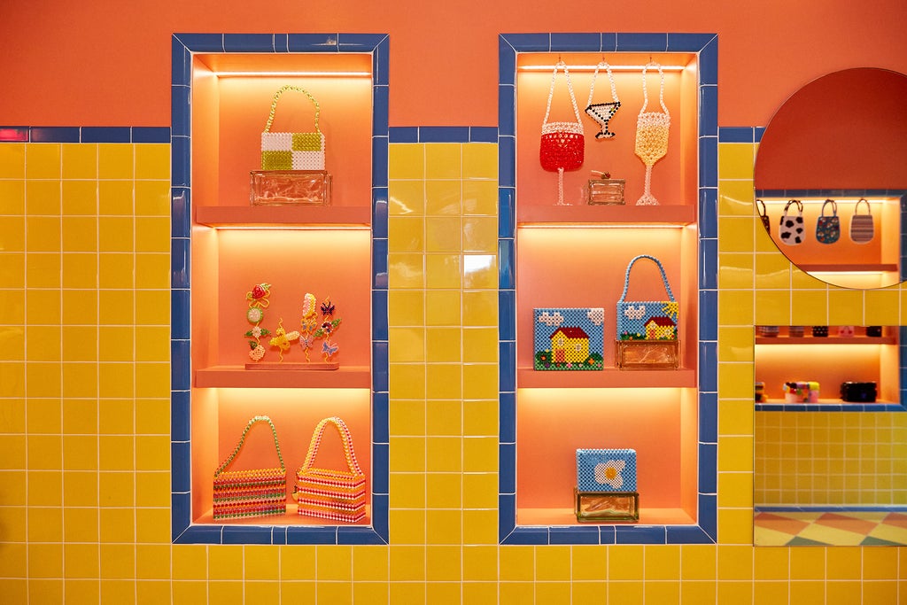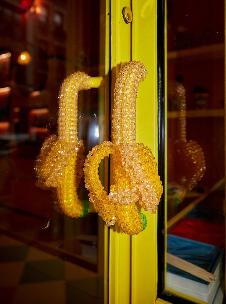 This sense of magic starts before you even enter the space as a beaded, banana-shaped door handle greets visitors. While kitschy by most fashion standards, the whimsical aesthetic makes perfect sense for the accessories brand that has skyrocketed into viral fame thanks to its Instagrammable beaded handbags that come in shapes ranging from a martini glass to a watermelon. As is the case with every Susan Alexandra bag, the banana door handle was entirely handmade.