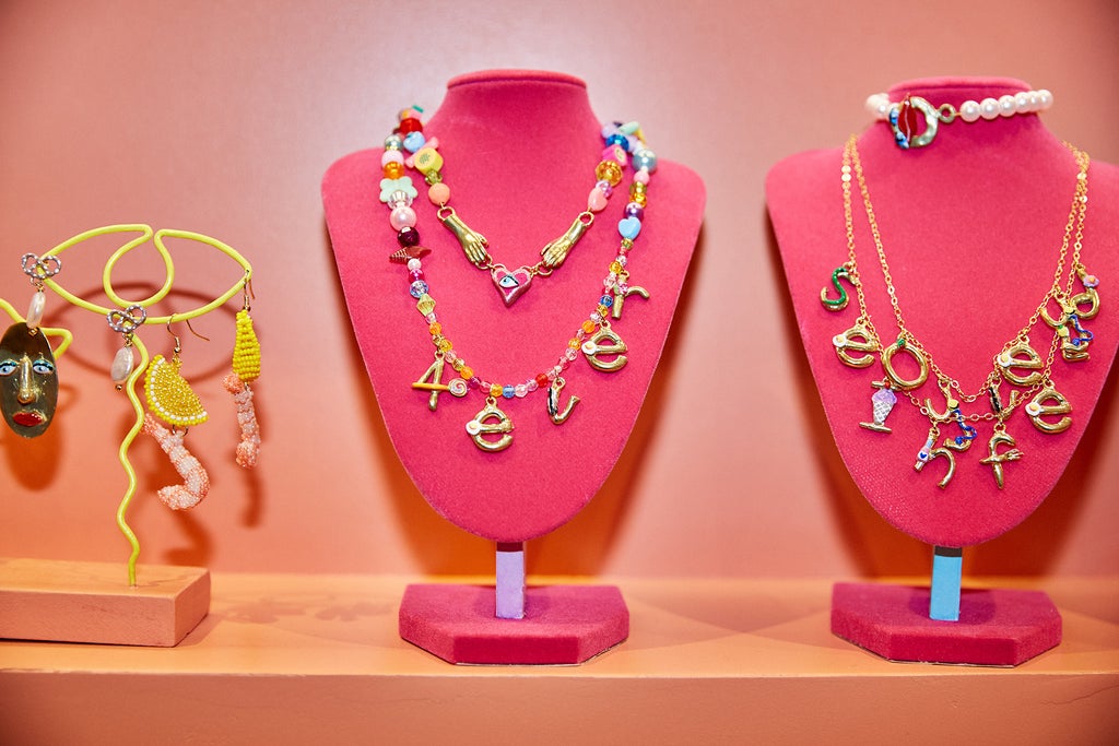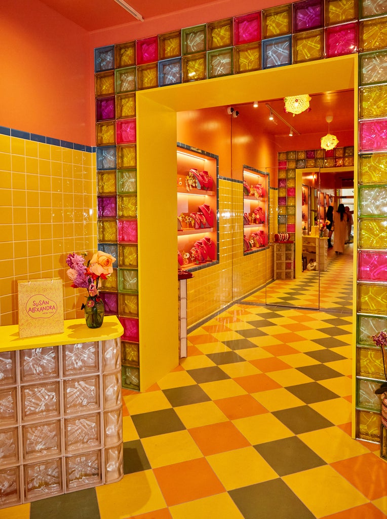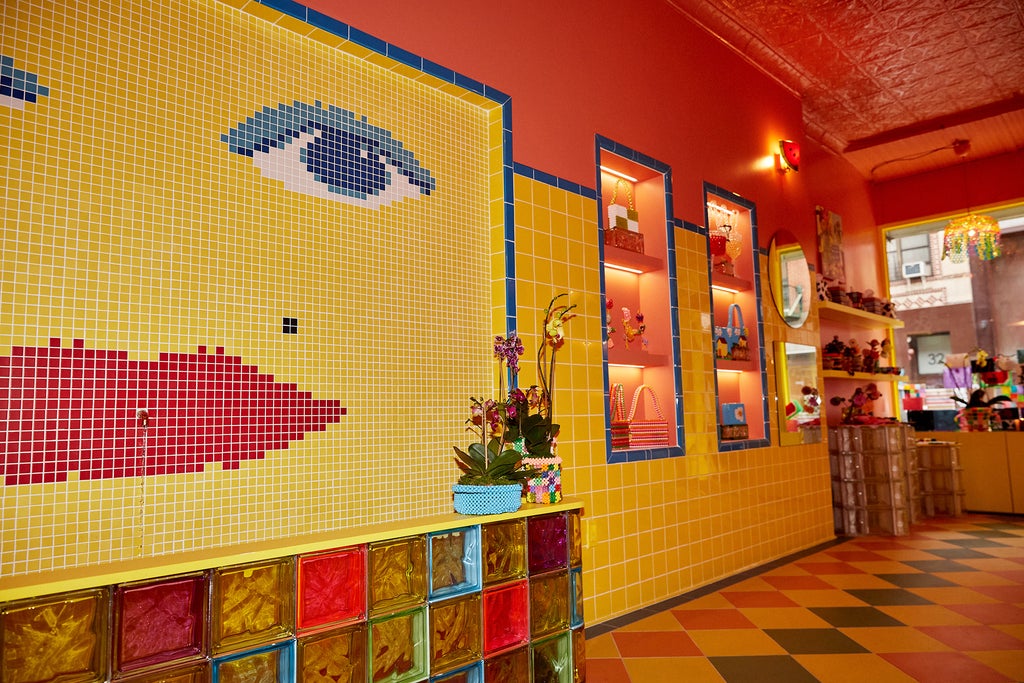 The result resembles the inside of one of Susan Alexandra’s multicolored handbags, which Korn confirms was the intention: “We laid the tile out just like we lay the bag design out.” Rows of Jolly Rancher-esque glass bricks make up the counters and frame the design centerpiece of the store: a tile fountain depicting a woman’s face, which Korn has come to view as a wishing well after visitors started throwing coins in it. “I think it just is magical to have a fountain,” says Korn. “[It] is based on the Best Friend Necklace, which is one of the first things I made. And it fits over your heart, and the intention is for it to be a protector and something to carry with you and protect you everywhere you go. It utilizes the evil eye…. [When it came to the store,] it was like, We need a protector. We need something or some entity looking out for us and bringing us joy and luck.”