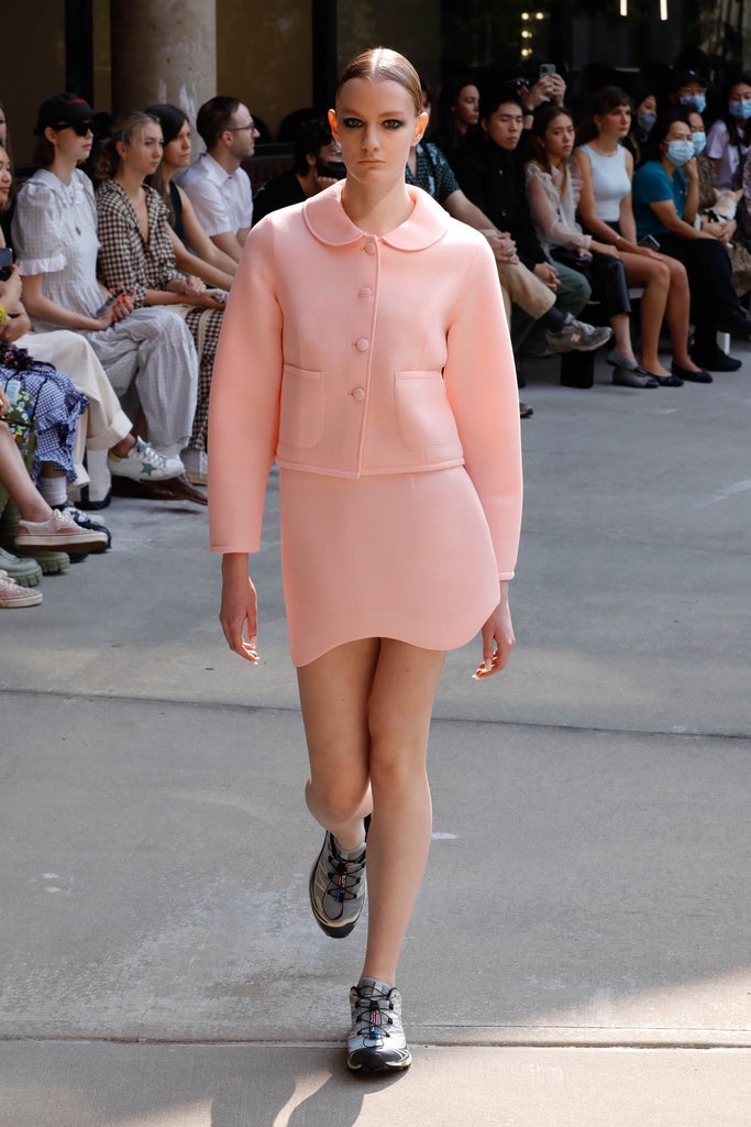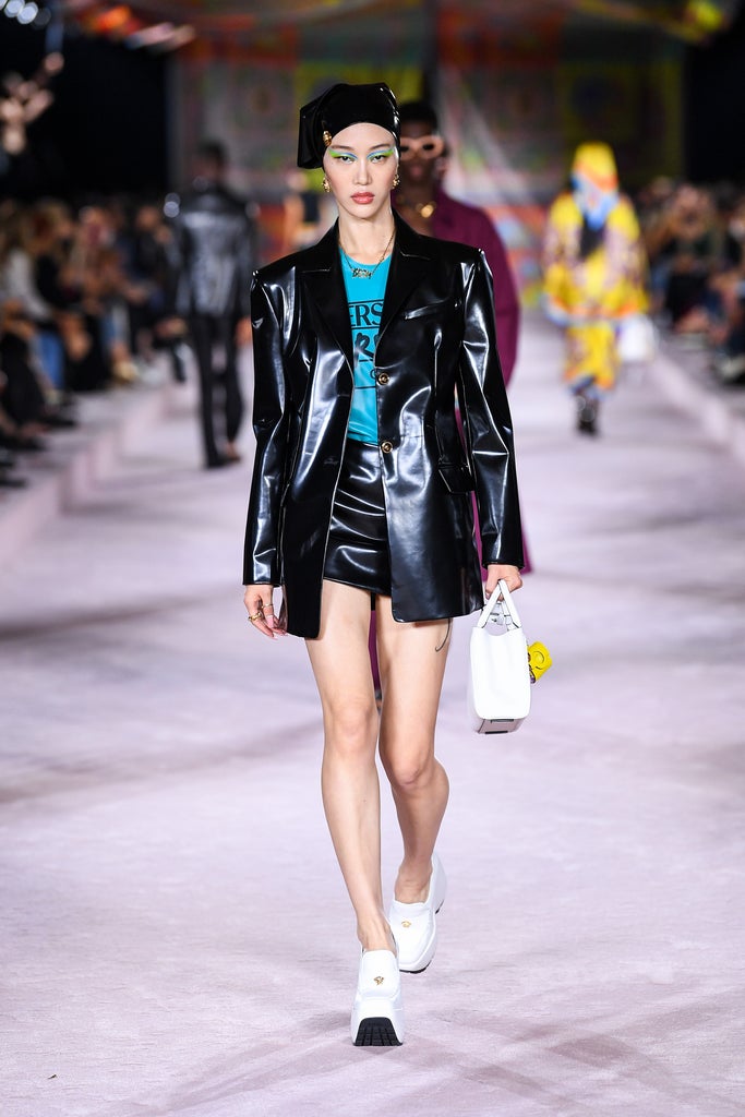 This season, contemporary brands took liberties with what has often been considered a conservative style. New York’s Sandy Liang showed a light pink neoprene version with a lopsided hemline, which the recent Target collaborator delightfully paired with sneakers. Meanwhile, Versace offered a black patent leather version, with a mini skirt so short the jacket might as well have been styled as a dress. As if the choice of fabric and cut weren’t daring enough, the look was paired with Bratz-like platforms more suited for a nightclub than a social luncheon. Then, there’s Miu Miu, which showed a lineup of Y2K-era micro-mini, midriff-baring skirts with unfinished hemlines alongside preppy blazers that only the students at Constance Billard would dare to wear past the school entrance.