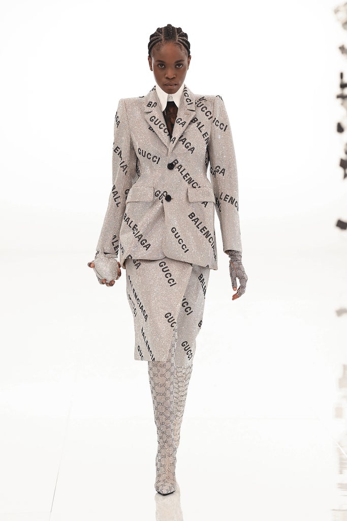 Earlier this year, Gucci and Balenciaga “hacked” each other’s collections in an attempt to push beyond the boundaries of conventional brand collaborations. The hacking manifested in the numerous ways designers Alessandro Michele and Demna embedded each brand’s DNA onto the other. But mostly, it was all about the logos. Think: Balenciaga “Hourglass” bags with Gucci monogram prints and a bedazzled blazer-and-skirt combo with the brands’ logos all over (pictured left).