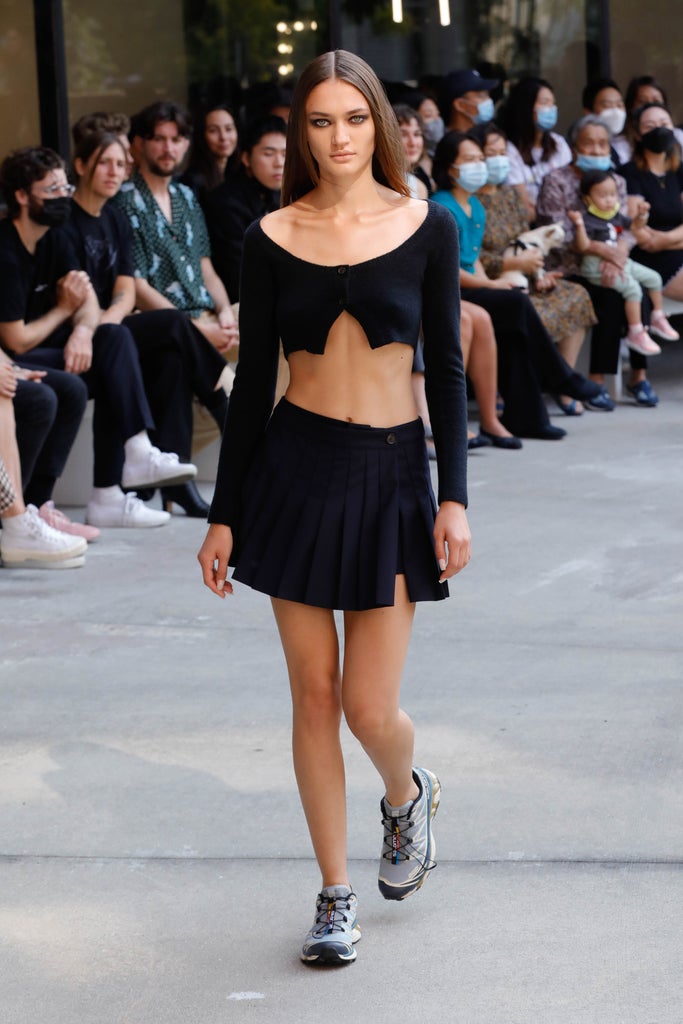 In response, designers have reimagined what workwear looks like beyond fashion-forward athleisure sets or designer sneakers that were trending even prior to the pandemic. In one of the most buzzed-about spring 2022 runway shows, Miu Miu showed blue button-down shirts worn with cropped blazers and leather micro mini skirt suits — preppy, risqué styling better suited for Constance Billard’s courtyard than your typical workday. But while the low-rise waistlines and barely-finished hemlines might have seemed inappropriate for the office in a pre-pandemic world, our priorities have changed. Why worry about the hemline of your skirt when the coverage of your face mask, healthcare benefits, and a way to retire are more important?