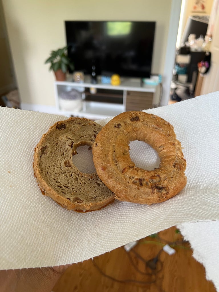 First, the texture. The outside is more reminiscent of a soft Sarah Lee bagel and not the smooth fresh-baked buns you get at a deli. Both bagels could give the crusts of Dave’s Crazy Bread loaf a run for its money. The interior is somewhat bagel-like — it’s comparable to the inside of a raisin bran muffin but could easily be mistaken for wheat bread. The ruggedness of the pastry didn’t turn me off. It felt like the brand was basically admitting “there’s no point in trying to perfectly emulate a classic, gluten-filled bagel,” and I respect that. I also admire the fact the bagels came pre-sliced. After the inspection, I popped them into the toaster, and voila! Two crisp and toasty bagels that looked quite delicious stared back at me.