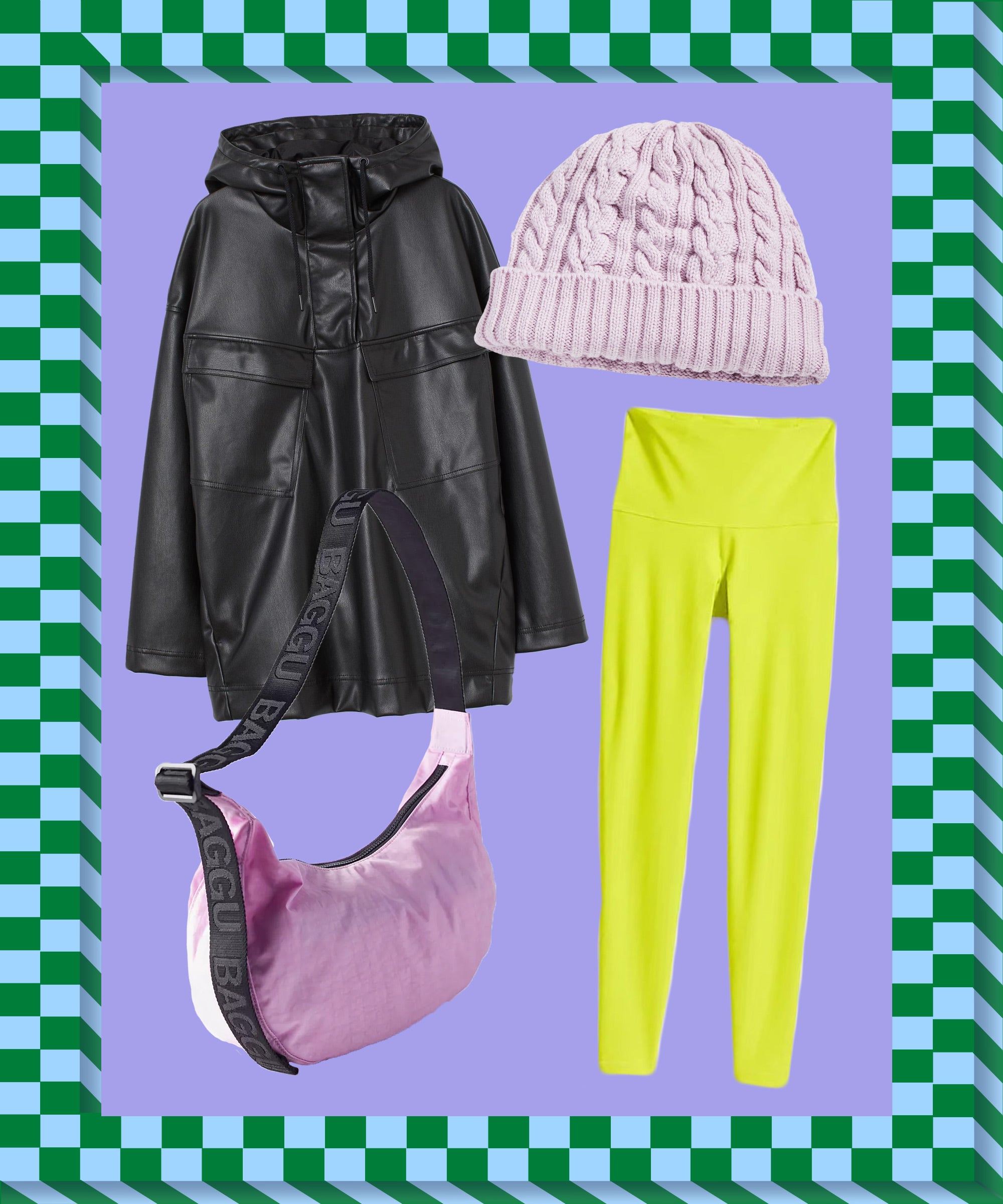 If you do have to venture outdoors, you can do so without ditching your quarantine best friend, aka your leggings. Enter: the ultimate street-style get-up. To complement these snake-print leggings (which boast a hidden pocket for your phone), we’re adding an oversized faux leather hoodie and pops of lavender.